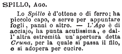 | Spillo, Ago - Lo Spillo è d'ottone o di ferro; ha piccolo capo, e serve per appuntare fogli, panni o altro. - L'Ago è di acciajo, ha punta acutissima, e dall'altra estremità un'apertura detta Cruna, per la quale si passa il filo, e si adopera per cucire. [immagine] |