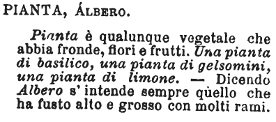 | Pianta, Albero - Pianta è qualunque vegetale che abbia fronde, fiori e frutti. Una pianta di basilico, una pianta di gelsomini, una pianta di limone. - Dicendo Albero s'intende sempre quello che ha fusto alto e grosso con molti rami. [immagine] |