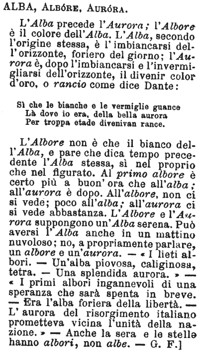Alba, Albore, Aurora - L'Alba precede l'Aurora; l'Albore è il colore dell'Alba. L'Alba, secondo l‘origine stessa, è l'imbiancarsi dell'orizzonte, foriero del giorno; l'Aurora è, dopo l'imbiancarsi e l'invermigliarsi dell'orizzonte, il divenir color d'oro, o rancio come dice Dante: