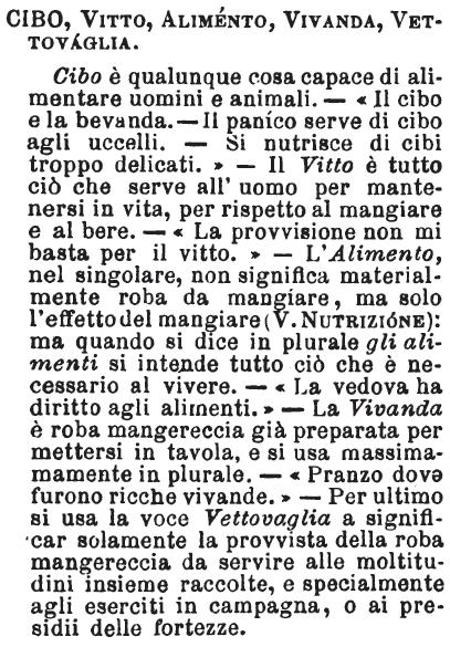 | Cibo, Vitto, Alimento, Vivanda, Vettovaglia - Cibo è qualunque cosa capace di alimentare uomini e animali. - «Il cibo e la bevanda. - Il paníco serve di cibo agli uccelli. - Si nutrisce di cibi troppo delicati.» - Il Vitto è tutto ciò che serve all'uomo per mantenersi in vita, per rispetto al mangiare e al bere. - «La provvisione non mi basta per il vitto.» - L'Alimento, nel singolare, non significa materialmente roba da mangiare, ma solo l'effetto del mangiare (V. Nutrizione): ma quando si dice in plurale gli alimenti si intende tutto ciò che è necessario al vivere. - «La vedova ha diritto agli alimenti.» - La Vivanda è roba mangereccia già preparata per mettersi in tavola, e si usa massimamamente in plurale. - «Pranzo dove furono ricche vivande.» - Per ultimo si usa la voce Vettovaglia a significar solamente la provvista della roba mangereccia da servire alle moltitudini insieme raccolte, e specialmente agli eserciti in campagna, o ai presidii delle fortezze. [immagine] |
