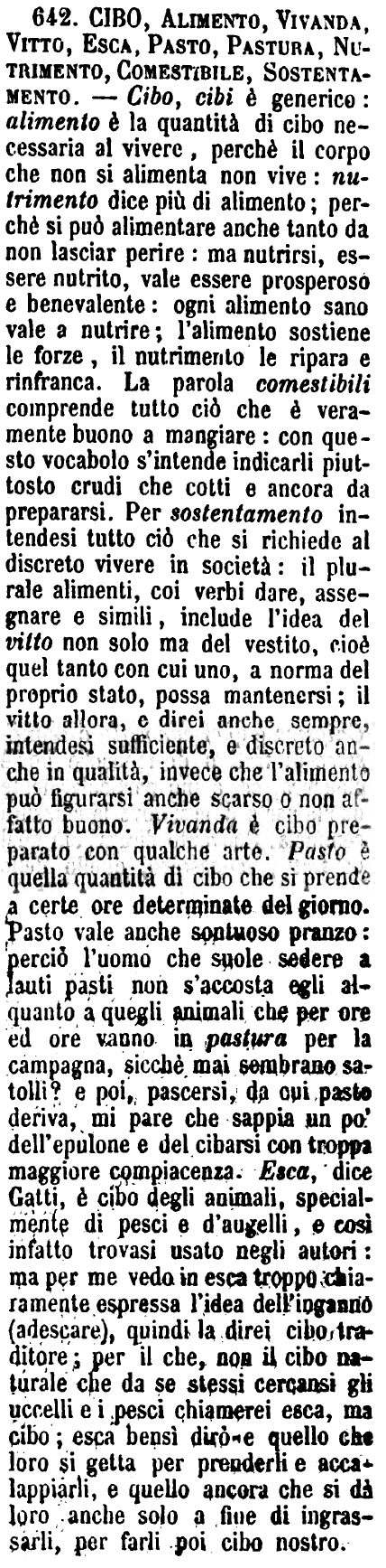 | Cibo, Alimento, Vivanda, Vitto, Esca, Pasto, Pastura, Nutrimento, Comestibile, Sostentamento - Cibo, cibi è generico: alimento è la quantità di cibo necessaria al vivere, perchè il corpo che non si alimenta non vive: nutrimento dice più di alimento; perchè si può alimentare anche tanto da non lasciar perire: ma nutrirsi, essere nutrito, vale essere prosperoso e benevalente: ogni alimento sano vale a nutrire; l'alimento sostiene le forze, il nutrimento le ripara e rinfranca. La parola comestibili comprende tutto ciò che è veramente buono a mangiare: con questo vocabolo s'intende indicarli piuttosto crudi che cotti e ancora da prepararsi. Per sostentamento intendesi tutto ciò che si richiede al discreto vivere in società: il plurale alimenti, coi verbi dare, assegnare e simili, include l'idea del vitto non solo ma del vestito, cioè quel tanto con cui uno, a norma del proprio stato, possa mantenersi; il vitto allora, e direi anche sempre, intendesi sufficiente, e discreto anche in qualità, invece che l'alimento può figurarsi anche scarso o non affatto buono. Vivanda è cibo preparato con qualche arte. Pasto è quella quantità di cibo che si prende a certe ore determinate del giorno. Pasto vale anche sontuoso pranzo: perciò l'uomo che suole sedere a lauti pasti non s'accosta egli alquanto a quegli animali che per ore ed ore vanno in pastura per la campagna, sicchè mai sembrano satolli? e poi, pascersi, da cui pasto deriva, mi pare che sappia un po' dell'epulone e del cibarsi con troppa maggiore compiacenza. Esca, dice Gatti, è cibo degli animali, specialmente di pesci e d'augelli, e così infatto trovasi usato negli autori: ma per me vedo in esca troppo chiaramente espressa l'idea dell'inganno (adescare), quindi la direi cibo traditore; per il che, non il cibo naturale che da se stessi cercansi gli uccelli e i pesci chiamerei esca, ma cibo; esca bensì dirò e quello che loro si getta per prenderli e accalappiarli, e quello ancora che si dà loro anche solo a fine di ingrassarli, per farli poi cibo nostro. [immagine] |