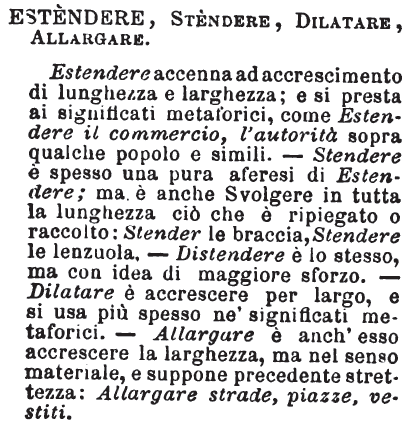 | Estendere, Stendere, Dilatare, Allargare - Estendere accenna ad accrescimento di lunghezza e larghezza; e si presta ai significati metaforici, come Estendere il commercio, l'autorità sopra qualche popolo e simili. - Stendere è spesso una pura aferesi di Estendere; ma è anche Svolgere in tutta la lunghezza ciò che è ripiegato o raccolto: Stender le braccia, Stendere le lenzuola. - Distendere è lo stesso, ma con idea di maggiore sforzo. - Dilatare è accrescere per largo, e si usa più spesso ne' significati metaforici. - Allargare è anch'esso accrescere la larghezza, ma nel senso materiale, e suppone precedente strettezza: Allargare strade, piazze, vestiti. [immagine] |