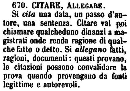 | Citare, Allegare - Si cita una data, un passo d'autore, una sentenza. Citare val poi chiamare qualcheduno dinanzi a magistrati onde renda ragione di qualche fatto o detto. Si allegano fatti, ragioni, documenti: questi provano, le citazioni possono convalidare la prova quando provengano da fonti legittime e autorevoli. [immagine] |