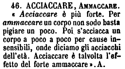 | Acciaccare, Ammaccare - «Acciaccare è più forte. Per ammaccare un corpo non sodo basta pigiare un poco. Poi s'acciacca un corpo a poco a poco per cause insensibili, onde diciamo gli acciacchi dell'età. Acciaccare è talvolta l'effetto del forte ammaccare». A. [immagine] |
