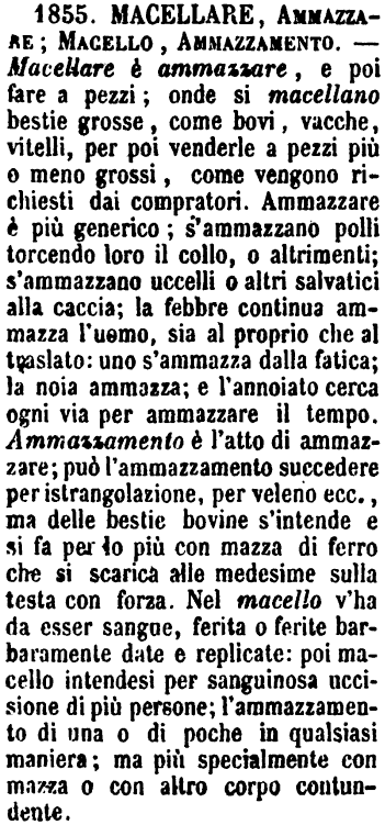 | Macellare, Ammazzare; Macello, Ammazzamento - Macellare è ammazzare, e poi fare a pezzi; onde si macellano bestie grosse, come bovi, vacche, vitelli, per poi venderle a pezzi più o meno grossi, come vengono richiesti dai compratori. Ammazzare è più generico; s'ammazzano polli torcendo loro il collo, o altrimenti; s'ammazzano uccelli o altri salvatici alla caccia; la febbre continua ammazza l'uomo, sia al proprio che al traslato: uno s'ammazza dalla fatica; la noia ammazza; e l'annoiato cerca ogni via per ammazzare il tempo. Ammazzamento è l'atto di ammazzare; può l'ammazzamento succedere per istrangolazione, per veleno ecc., ma delle bestie bovine s'intende e si fa per lo più con mazza di ferro che si scarica alle medesime sulla testa con forza. Nel macello v'ha da esser sangue, ferita o ferite barbaramente date e replicate: poi macello intendesi per sanguinosa uccisione di più persone; l'ammazzamento di una o di poche in qualsiasi maniera; ma più specialmente con mazza o con altro corpo contundente. [immagine] |