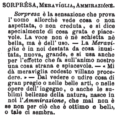 Sorpresa, Meraviglia, Ammirazione - Sorpresa è la sensazione che prova l'uomo allorchè vede cosa o non aspettata, o non creduta, e si dice specialmente di cosa grata e piacevole. La voce non è nè schietta nè bella, ma è dell'uso. - La Meraviglia è in noi destata da cosa inusitata, nuova, grande, e si usa anche per l'effetto che fa sull'animo nostro una cosa strana e spiacevole. - «Mi dà meraviglia codesto villano procedere.» - Dal vedere o udire cosa di gran pregio o nelle belle arti, o nelle opere dell'ingegno, o anche le sublimi bellezze della natura, nasce in noi l'Ammirazione, che mai non è se non per ciò che è ottimo e bello, o tale ci sembra. [immagine]