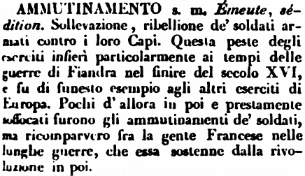 Ammutinamento - s. m. Émeute, sédition. Sollevazione, ribellione de' soldati armati contro i loro Capi. Questa peste degli eserciti infierì particolarmente ai tempi delle guerre di Fiandra nel finire del secolo XVI, e fu di funesto esempio agli altri eserciti di Europa. Pochi d'allora in poi e prestamente soffocati furono gli ammutinamenti de' soldati, ma ricomparvero fra la gente Francese nelle lunghe guerre, che essa sostenne dalla rivoluzione in poi. [immagine]