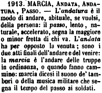 | Marcia, Andata, Andatura, Passo - L'andatura è il modo di andare, abituale, se vuolsi, della persona: il passo, lento, naturale, accelerato, segna la maggiore o minor fretta di chi va. L'andata ha per opposto la venuta; sono i due atti finali dell'andare e del venire: la marcia è l'andare delle truppe in ordinanza, o quando fanno cammino: marcia dicesi il suono de' tamburi o della musica militare che segna il tempo del passo ai soldati. [immagine] |