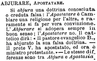| Abjurare, Apostatare - Si abjura una dottina conosciuta o creduta falsa: l'Apostatare è Cambiare una religione per l'altra, e raramente si fa per vera convinzione. L'Abjurare si adopera sempre in buon senso; l'Apostatare no. Il cattolico dirà: «Il pastore evangelico B., ha abjurato la sua falsa dottrina. - Il prete V. ha apostatato, ed ora è ministro protestante.» - Le stesse differenze sono tra Abjura e Apostasia. [immagine] |