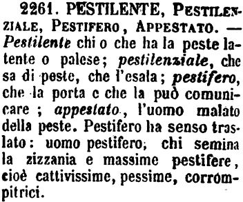 Pestilente, Pestilenziale, Pestifero, Appestato - Pestilente chi o che ha la peste latente o palese; pestilenziale, che sa di peste, che l'esala; pestifero, che la porta e che la può comunicare; appestato, l'uomo malato della peste. Pestifero ha senso traslato: uomo pestifero; chi semina la zizzania e massime pestifere, cioè cattivissime, pessime, corrompitrici. [immagine]