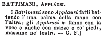 | Battimani, Applausi - I Battimani sono Applausi fatti battendo l'una palma della mano con l'altra; gli Applausi si fanno con la voce e anche con mazze e co' piedi, massime ne' teatri. G.F. [immagine] |