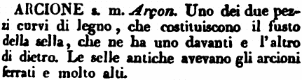 | Arcione - s. m. Arçon. Uno dei due pezzi curvi di legno, che costituiscono il fusto della sella, che ne ha uno davanti e l'altro di dietro. Le selle antiche avevano gli arcioni ferrati e molto alti. [immagine] |