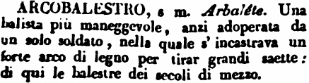 Arcobalestro - s. m. Arbaléte. Una balista più maneggevole, anzi adoperata da un solo soldato, nella quale s'incastrava un forte arco di legno per tirar grandi saette: di qui le balestre dei secoli di mezzo. [immagine]