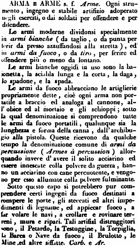 | Arma e Arme - s. f. Arme. Ogni strumento, ingegno e stabile artifizio adoperato negli eserciti, o dai soldati per offendere e per difendere.