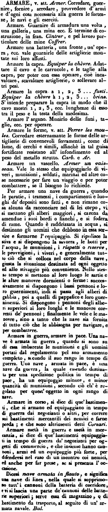 Armare. Guarnire di armadura una volta, una galleria, una mina ecc. È termine di costruzione, in fran. Cintrer, e pel lavoro particolare delle mine Coffrer. Armare una batteria, una fronte, un'opera, ecc. vale guarnirle delle artiglierie montate sui loro affusti. Armare la capra. Équiper la chèvre. Adattare il cavo e le carrucole, e le taglie alla capra, per poter con essa operare, cioè incavalcare, scavalcare artiglierie, o sollevare altri pesi. Armare la capra a 1, 2, 3... fusti. Équiper la chèvre à 1, 2, 3...brins. S'intende preparare la capra in modo che il cavo mostri 1, 2, 3, ecc. lunghezze di esso tra il peso e la testa della medesima. Armare l'argano. Munirlo delle funi, taglie, ecc. per operare. Armare le forme, v. att. Ferrer les moules. Corredare esternamente le forme delle artiglierie di convenevoli ferramenti, come di lame, di cerchi e simili, affinchè in tal guisa fortificate resistano all'infondimento ed al peso del metallo strutto. Carb. e Ar. Armare un vascello. Armer un vaisseau. Vale lo stesso che equipaggiarlo di viveri, munizioni, soldati, marinai ed altre cose necessarie per fare un viaggio e per poter combattere, se il bisogno lo richiede. Per armare una nave da guerra, quando le paratie, i tramezzi, i compartimenti e luoghi de' depositi sono fatti, e non rimane cosa alcuna da racconciare nel di lei corpo, vi si mettono gli alberi maggiori, si carena da amendue i suoi bordi o fianchi, e si fodera di rame. Quando è raddrizzata in acqua, si destinano gli uomini che debbono in essa servire e formarne l'equipaggio. Si ripulisce la stiva e si dispongono la savorra, le botti per l'acqua, le munizioni, i rispetti o riserve, le provvigioni, i viveri, e generalmente tutto ciò che si colloca nel corpo della nave, giusta la situazione destinata ad ogni oggetto ed allo stivaggio più conveniente. Nello stesso tempo si mettono al loro luogo le sartie e le altre manovre dormienti o ferme: successivamente si dispongono i bassi pennoni e loro guernimenti, indi si passa agli alberi di gabbia, poi a quelli di pappafico e loro guernimenti. Si dispongono i pennoni degli alberi superiori ai loro luoghi e le manovre correnti de' pennoni; finalmente le vele e le manovre, sino a tanto che la nave sia fornita di tutto ciò che le abbisogna per navigare, e per combattere. Armare in guerra, armare in pace. Una nave è armata in guerra, quando si sono su di essa imbarcate le munizioni e gli uomini portati dal regolamento pel suo armamento completo, secondo il suo rango in tempo di guerra. Una nave, armata in pace, è una nave da guerra, la quale essendo destinata per una spedizione politica in tempo di pace, ha un equipaggio minore, e minor quantità di munizioni, secondo ciò ch'è regolato per quest'oggetto in ogni rango di nave. Armare in corso, si dice di que' bastimenti, che si armano ed equipaggiano in tempo di guerra dai negozianti o altri, per correre sui bastimenti mercantili dei nemici e farne preda; e che sono altrimenti detti Corsari. Armare metà in guerra e metà in mercanzia, si dice di que' bastimenti equipaggiati in tempo di guerra da' negozianti per oggetti di commercio, e che insieme hanno cannoni, armi ed un equipaggio più forte, per difendersi nel caso di un incontro coi nemici, ed anche per far prese, se si presenta l'occasione. Dicesi nave armata in flauto, e significa una nave di linea, nella quale si sopprimono tutt'i cannoni della batteria di corridore, e vi si lascia una parte de' cannoni delle batterie superiori; serve essa di magazzino, o di bastimento da trasporto, al seguito di un'armata navale. Bal. [immagine] |