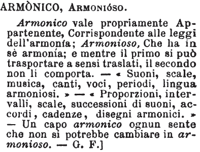 | Armonico, Armonioso - Armonico vale propriamente Appartenente, Corrispondente alle leggi dell'armonia; Armonioso, Che ha in sè armonia; e mentre il primo si può trasportare a sensi traslati, il secondo non li comporta. - «Suoni, scale, musica, canti, voci, periodi, lingua armoniosi.» - «Proporzioni, intervalli, scale, successioni di suoni, accordi, cadenze, disegni armonici.» - Un capo armonico ognun sente che non si potrebbe cambiare in armonioso. - G. F.] [immagine] |