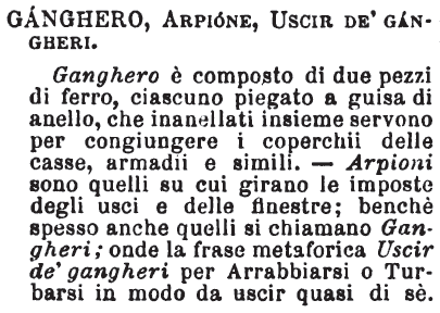 | Ganghero, Arpione, Uscir de’ gangheri - Ganghero è composto di due pezzi di ferro, ciascuno piegato a guisa di anello, che inanellati insieme servono per congiungere i coperchii delle casse, armadii e simili. - Arpioni sono quelli su cui girano le imposte degli usci e delle finestre; benchè spesso anche quelli si chiamano Gangheri; onde la frase metaforica Uscir de' gangheri per Arrabbiarsi o Turbarsi in modo da uscir quasi di sè. [immagine] |