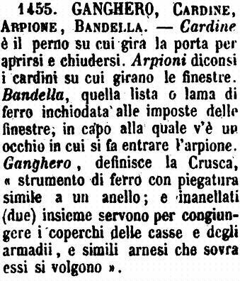 | Ganghero, Cardine, Arpione, Bandella - Cardine è il perno su cui gira la porta per aprirsi e chiudersi. Arpioni diconsi i cardini su cui girano le finestre. Bandella, quella lista o lama di ferro inchiodata alle imposte delle finestre, in capo alla quale v'è un occhio in cui si fa entrare l'arpione. Ganghero, definisce la Crusca, «strumento di ferro con piegatura simile a un anello; e inanellati (due) insieme servono per congiungere i coperchi delle casse e degli armadii, e simili arnesi che sovra essi si volgono». [immagine] |