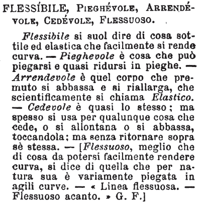 | Flessibile, Pieghevole, Arrendevole, Cedevole, Flessuoso - Flessibile si suol dire di cosa sottile ed elastica che facilmente si rende curva. - Pieghevole è cosa che può piegarsi e quasi ridursi in pieghe. - Arrendevole è quel corpo che premuto si abbassa e si riallarga, che scientificamente si chiama Elastico. - Cedevole è quasi lo stesso; ma spesso si usa per qualunque cosa che cede, o si allontana o si abbassa, toccandola; ma senza ritornare sopra sè stessa. - [Flessuoso, meglio che di cosa da potersi facilmente rendere curva, si dice di quella che per natura sua è variamente piegata in agili curve. - «Linea flessuosa. - Flessuoso acanto.» G. F.] [immagine] |