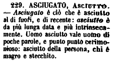 | Asciugato, Asciutto - Asciugato è ciò che è asciutto al di fuori, e di recente: asciutto è da più lunga data e più intrinsecamente. Uomo asciutto vale uomo di poche parole, e punto punto cerimonioso: asciutto della persona, chi è magro e stecchito. [immagine] |