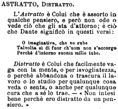 Astratto, Distratto - L'Astratto è Colui che è assorto in qualche pensiero, e però non ode o vede ciò che gli sta d'attorno; è ciò che Dante significò in questi versi: