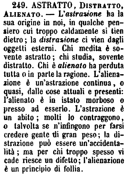 Astratto, Distratto, Alienato - L'astrazione ha la sua origine in noi, in qualche pensiero cui troppo caldamente si tien dietro; la distrazione ci vien dagli oggetti esterni. Chi medita è sovente astratto; chi studia, sovente distratto. Chi è alienato ha perduta tutta o in parte la ragione. L'alienazione è un'astrazione continua, o quasi, dalle cose attuali e presenti: l'alienato è in istato morboso o presso ad esserlo. L'astrazione è un abito; molti lo contraggono, o talvolta se n'infingono per farsi credere gente di gran peso; la distrazione può essere un'accidentalità; ma per chi troppo spesso vi cade riesce un difetto; l'alienazione è un principio di follia. [immagine]
