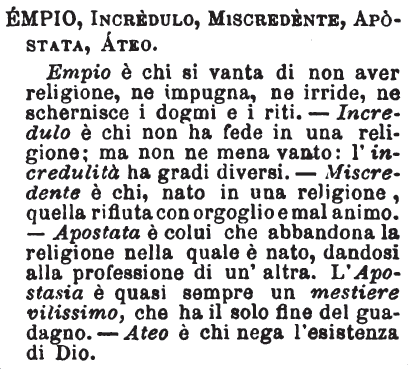 | Empio, Incredulo, Miscredente, Apostata, Ateo - Empio è chi si vanta di non aver religione, ne impugna, ne irride, ne schernisce i dogmi e i riti. - Incredulo è chi non ha fede in una religione; ma non ne mena vanto: l'incredulità ha gradi diversi. - Miscredente è chi, nato in una religione, quella rifiuta con orgoglio e mal animo. - Apostata è colui che abbandona la religione nella quale è nato, dandosi alla professione di un'altra. L'Apostasia è quasi sempre un mestiere vilissimo, che ha il solo fine del guadagno. - Ateo è chi nega l'esistenza di Dio. [immagine] |