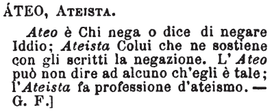 | Ateo, Ateista - Ateo è Chi nega o dice di negare Iddio; Ateista Colui che ne sostiene con gli scritti la negazione. L'Ateo può non dire ad alcuno ch'egli è tale; l'Ateista fa professione d'ateismo. - G. F. [immagine] |