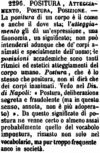 | Positura, Atteggiamento, Postura, Posizione - La positura di un corpo è il come e anche il dove sta; l'atteggiamento gli dà un'espressione, una fisonomia, un significato; non può intendersi adunque che de' corpi animati e specialmente dell'uomo; le posizioni accademiche sono tanti ritmici ed estetici atteggiamenti del corpo umano. Postura, che è lo stesso che positura, non si dirà che dei corpi inanimati. Vedo nel Diz. di Napoli: « Postura, deliberazione segreta e fraudolente (ma in questo senso, annota, non è più adoperato) ». Da questo significato di postura ne venne certo o almeno assai probabilmente quello del vocabolo impostura, rimasto non solo nel vocabolario, ma pur troppo frequente anco in società. [immagine] |