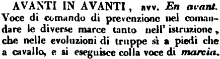| Avanti in avanti - avv. En avant. Voce di comando di prevenzione nel comandare le diverse marce tanto nell'istruzione, che nelle evoluzioni di truppe sì a piedi che a cavallo, e si eseguisce colla voce di marcia. [immagine] |