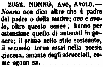| Nonno, Avo, Avolo - Nonno non dice altro che il padre del padre o della madre; avo e avolo, oltre questo senso, hanno per estensione quello di antenati in genere; il primo nello stile sostenuto, il secondo torna assai nella poesia giocosa, amante degli sdruccioli, come ognun sa. [immagine] |