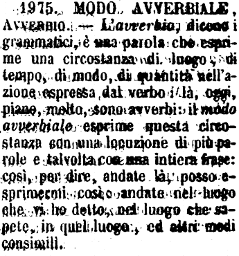 | Modo Avverbiale, Avverbio - L'avverbio, dicono i grammatici, è una parola che esprime una circostanza di luogo, di tempo, di modo, di quantità nell'azione espressa dal verbo: là, oggi, piano, molto, sono avverbi: il modo avverbiale esprime questa circostanza con una locuzione di più parole e talvolta con una intiera frase: così, per dire, andate là, posso esprimermi così: andate nel luogo che vi ho detto, nel luogo che sapete, in quel luogo, ed altri modi consimili. [immagine] |