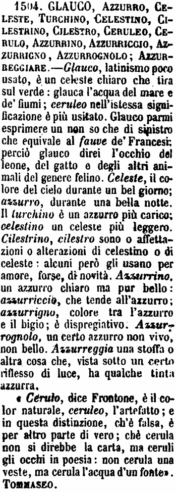 | Azzurrognolo - Agg. Azzurro non pieno e non bello. Fr. Giord. Pred. R. (C) Bende portano al collo di colore azzurrognolo. T. Nubi azzurrognole. |