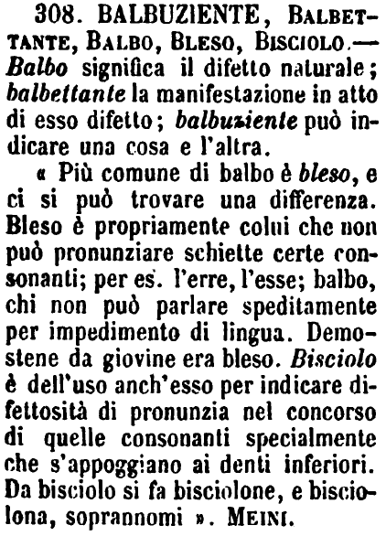 «Più comune di balbo è bleso, e ci si può trovare una differenza. Bleso è propriamente colui che non può pronunziare schiette certe consonanti; per es. l'erre, l'esse; balbo, chi non può parlare speditamente per impedimento di lingua. Demostene da giovine era bleso. Bisciolo è dell'uso anch'esso per indicare difettosità di pronunzia nel concorso di quelle consonanti specialmente che s'appoggiano ai denti inferiori. Da bisciolo si fa bisciolone, e bisciolona, soprannomi». Meini. [immagine] |