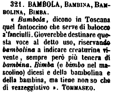 | Bambola, Bambina, Bambolina, Bimba - «Bambola, dicono in Toscana quel fantoccino che serve di balocco a' fanciulli. Gioverebbe destinare questa voce al detto uso, riservando bambolina a indicare creaturina vivente, sempre però più tenera di bambina. Bimba (e bimbo nel mascolino) dicesi e della bambolina e della bambina, ma tiene non so che di vezzeggiativo». Tommaseo. [immagine] |