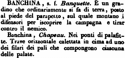 | Banchina - s. f. Banquette. È un gradino che ordinariamente si fa di terra, posto al piede del parapetto, sul quale montano i difensori per iscoprire la campagna e tirar contro il nemico.