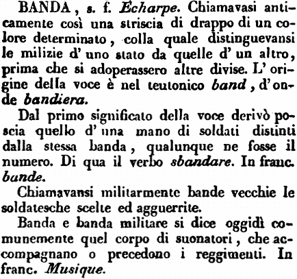 Banda - s. f. Echarpe. Chiamavasi anticamente così una striscia di drappo di un colore determinato, colla quale distinguevansi le milizie d'uno stato da quelle d'un altro, prima che si adoperassero altre divise. L'origine della voce è nel teutonico band, d'onde bandiera.