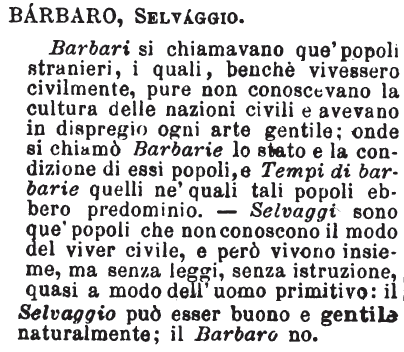 Barbaro, Selvaggio - Barbari si chiamavano que' popoli stranieri, i quali, benchè vivessero civilmente, pure non conoscevano la cultura delle nazioni civili e avevano in dispregio ogni arte gentile; onde si chiamò Barbarie lo stato e la condizione di essi popoli, e Tempi di barbarie quelli ne' quali tali popoli ebbero predominio. - Selvaggi sono que' popoli che non conoscono il modo del viver civile, e però vivono insieme, ma senza leggi, senza istruzione, quasi a modo dell'uomo primitivo: il Selvaggio può esser buono e gentile naturalmente; il Barbaro no. [immagine]