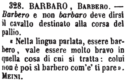 «Nella lingua parlata, essere barbero, vale essere molto bravo in quella cosa di cui si tratta: colui non è poi sì barbero com'e' ti pare». Meini. [immagine]