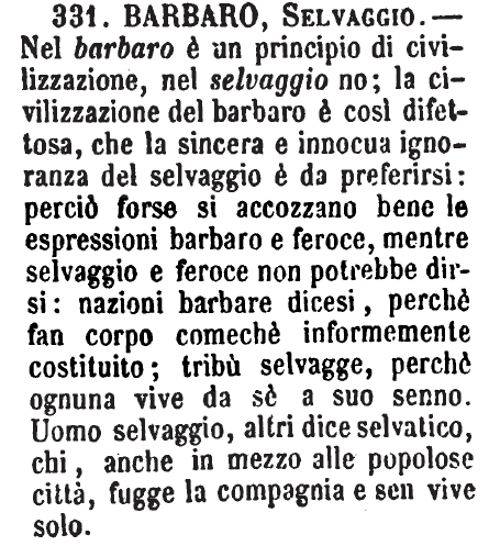 Barbaro, Selvaggio - Nel barbaro è un principio di civilizzazione, nel selvaggio no; la civilizzazione del barbaro è così difettosa, che la sincera e innocua ignoranza del selvaggio è da preferirsi: perciò forse si accozzano bene le espressioni barbaro e feroce, mentre selvaggio e feroce non potrebbe dirsi: nazioni barbare dicesi, perchè fan corpo comechè informemente costituito; tribù selvagge, perchè ognuna vive da sè a suo senno. Uomo selvaggio, altri dice selvatico, chi, anche in mezzo alle popolose città, fugge la compagnia e sen vive solo. [immagine]