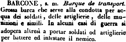 Barcone - s. m. Barque de transport. Grossa barca che serve alla condotta per acqua dei soldati, delle artiglierie, delle munizioni e simili. In alcuni casi di guerra si adopera altresì a portar soldati od artiglierie per battere ed infestare il nemico. [immagine]