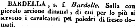 | Bardella - s. f. Bardelle. Sella con piccolo arcione dinanzi, di cui per lo più si servono i cavalcatori pei poledri di fresco domati. [immagine] |