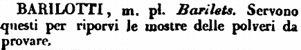 | Barilotti - m. pl. Barilets. Servono questi per riporvi le mostre delle polveri da provare. [immagine] |