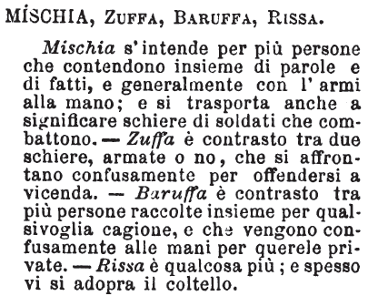| Mischia, Zuppa, Baruffa, Rissa - Mischia s'intende per più persone che contendono insieme di parole e di fatti, e generalmente con l'armi alla mano; e si trasporta anche a significare schiere di soldati che combattono. - Zuffa è contrasto tra due schiere, armate o no, che si affrontano confusamente per offendersi a vicenda. - Baruffa è contrasto tra più persone raccolte insieme per qualsivoglia cagione, e che vengono confusamente alle mani per querele private. - Rissa è qualcosa più; e spesso vi si adopra il coltello. [immagine] |
