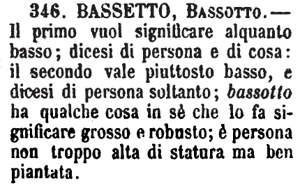 | Bassetto, Bassotto - Il primo vuol significare alquanto basso; dicesi di persona e di cosa: il secondo vale piuttosto basso, e dicesi di persona soltanto; bassotto ha qualche cosa in sè che lo fa significare grosso e robusto; è persona non troppo alta di statura ma ben piantata. [immagine] |