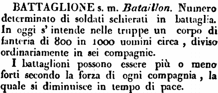 Battaglione - s. m. Bataillon. Numero determinato di soldati schierati in battaglia. In oggi s'intende nelle truppe un corpo di fanteria di 800 in 1000 uomini circa, diviso ordinariamente in sei compagnie.