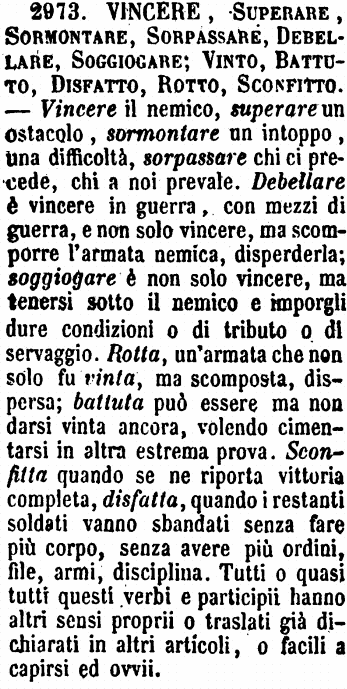Vincere, Superare, Sormontare, Sorpassare, Debellare, Soggiogare; Vinto, Battuto, Disfatto, Rotto, Sconfitto - Vincere il nemico, superare un ostacolo, sormontare un intoppo, una difficoltà, sorpassare chi ci precede, chi a noi prevale. Debellare è vincere in guerra, con mezzi di guerra, e non solo vincere, ma scomporre l'armata nemica, disperderla; soggiogare è non solo vincere, ma tenersi sotto il nemico e imporgli dure condizioni o di tributo o di servaggio. Rotta, un'armata che non solo fu vinta, ma scomposta, dispersa; battuta può essere ma non darsi vinta ancora, volendo cimentarsi in altra estrema prova. Sconfitta quando se ne riporta vittoria completa, disfatta, quando i restanti soldati vanno sbandati senza fare più corpo, senza avere più ordini, file, armi, disciplina. Tutti o quasi tutti questi verbi e participii hanno altri sensi proprii o traslati già dichiarati in altri articoli, o facili a capirsi ed ovvii. [immagine]