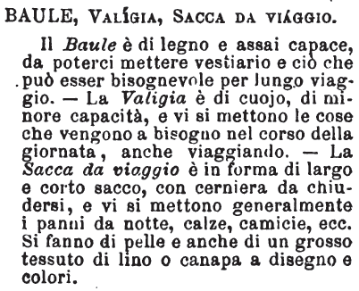 | Baule, Valigia, Sacca da viaggio - Il Baule è di legno e assai capace, da poterci mettere vestiario e ciò che può esser bisognevole per lungo viaggio. - La Valigia è di cuojo, di minore capacità, e vi si mettono le cose che vengono a bisogno nel corso della giornata, anche viaggiando. - La Sacca da viaggio è in forma di largo e corto sacco, con cerniera da chiudersi, e vi si mettono generalmente i panni da notte, calze, camicie, ecc. Si fanno di pelle e anche di un grosso tessuto di lino o canapa a disegno e colori. [immagine] |