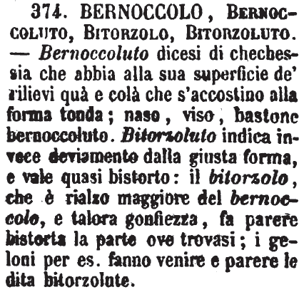 | Bernoccolo, Bernoccoluto, Bitorzolo, Bitorzoluto - Bernoccoluto dicesi di chechessia che abbia alla sua superficie de' rilievi quà e colà che s'accostino alla forma tonda; naso, viso, bastone bernoccoluto. Bitorzoluto indica invece deviamento dalla giusta forma, e vale quasi bistorto: il bitorzolo, che è rialzo maggiore del bernoccolo, e talora gonfiezza, fa parere bistorta la parte ove trovasi; i geloni per es. fanno venire e parere le dita bitorzolute. [immagine] |