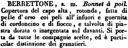 | Berrettone - s. m. Bonnet à poil. Copertura del capo alta, rotonda, fatta di pelle d'orso coi peli all'infuori e guernita di cordoncino e di fiocco, e talvolta di piastra dorata o inargentata sul davanti. Si porta da tutte le compagnie scelte, ed è particolar distinzione dei granatieri. [immagine] |